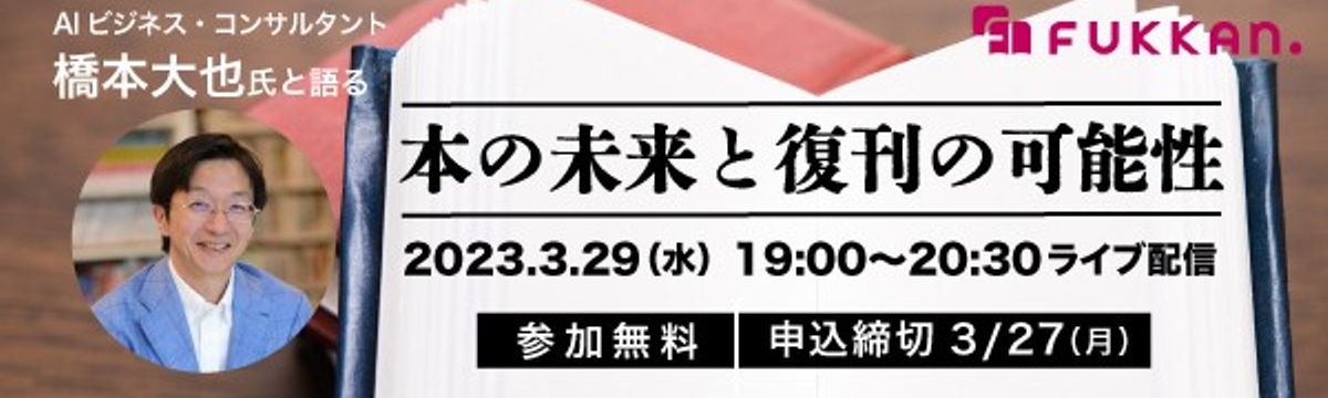 復刊ドットコム over 2 years ago Follow 岩本 利明 3/29オンラインライブトークイベントを開催「AIビジネス・コンサルタント橋本大也氏と語る 本の未来と復刊の可能性」 3/29オンラインライブトークイベントを開催「AIビジネス・コンサルタント橋本大也氏と語る 本の未来と復刊の可能性」株式会社復刊ドットコム(代表取締役社長:岩本利明。以下、復刊ドットコム)は、2... Read more