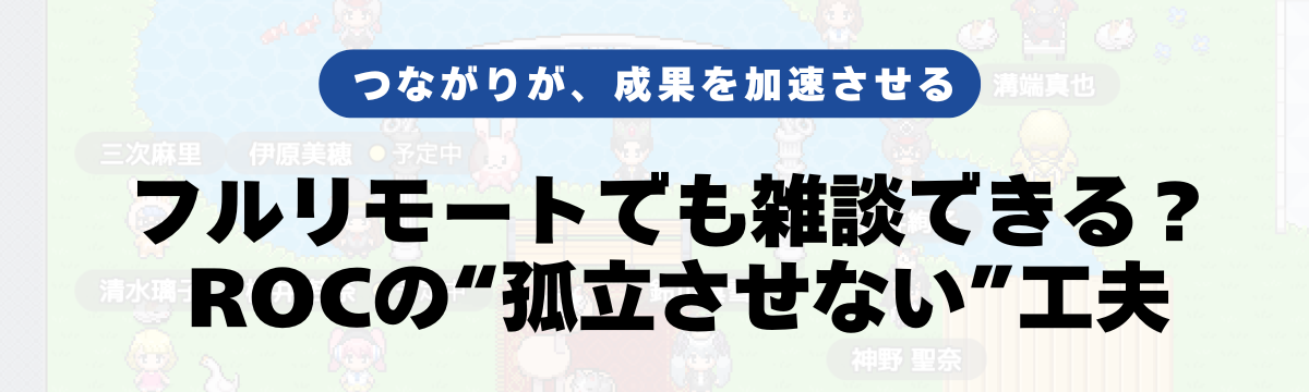 株式会社ROC 2 months ago Follow 井岡 悠子 フルリモートでも雑談できる? ROCの“孤立させない”工夫 1. はじめに:リモートならではの悩み「フルリモート=自由で快適」と言われることも多いですが、実際にやってみると“孤独感”や“コミュニケーションのすれ違い”といった悩みにぶつかることも少なくあり... Read more