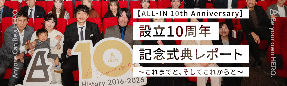 オールイン株式会社 about 5 hours ago Follow 宮園 貴大 【ALL-IN 10th Anniversary】設立10周年記念式典レポート ~これまでと、そしてこれからと~ こんにちは!ALL-IN 広報担当、気付けばもうすぐ入社5年目の宮園です。2026年3月23日(月)、オールイン株式会社は設立10周年の記念式典を開催いたしました(News記事&ダイジェストムー... Read more