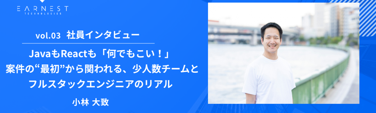 株式会社アーネストテクノロジーズ 17 days ago Follow M C vol.03 社員インタビュー / JavaもReactも「何でもこい!」 案件の“最初”から関われる、少人数チー... 「とりあえずやってみよう」――柔軟な発想で挑む、フルスタックエンジニアへの道「悩みこまずに、やってみてなんとかしましょう」――そんな前向きなモットーを掲げるエンジニアの小林さん。専門学校卒業後か... Read more