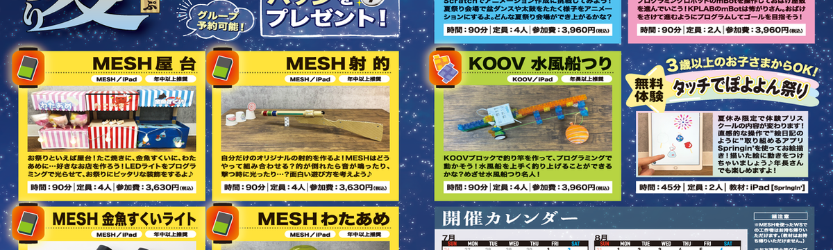 こども向けプログラミング教室 over 3 years ago Follow 山口 敦子 夏休みのプログラムワークショップ開催 『こども向けプログラミング教室』で一番大変なイベント、『夏休みワークショップ』の季節がやってまいりました。今年のテーマは「夏祭り」毎年、夏休みに、普段教室で使っているプログラミング教材を使って1... Read more