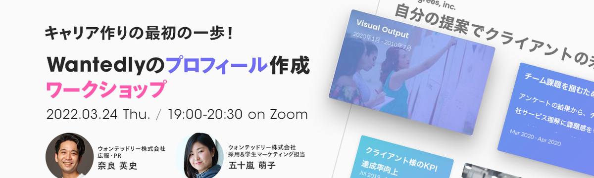Wantedly, Inc. over 3 years ago Follow Moeko Igarashi and 1 others \\学生限定// 就活やインターンにWantedlyを活用しよう!「プロフィール作成ワークショップ」初開催 「Wantedlyのプロフィールの使い方を知りたい!」という多くのユーザーさんの声を受け、2022年3月24日(木)の19時より、Wantedlyのプロフィールの作り方のコツについて学べるイベン... Read more