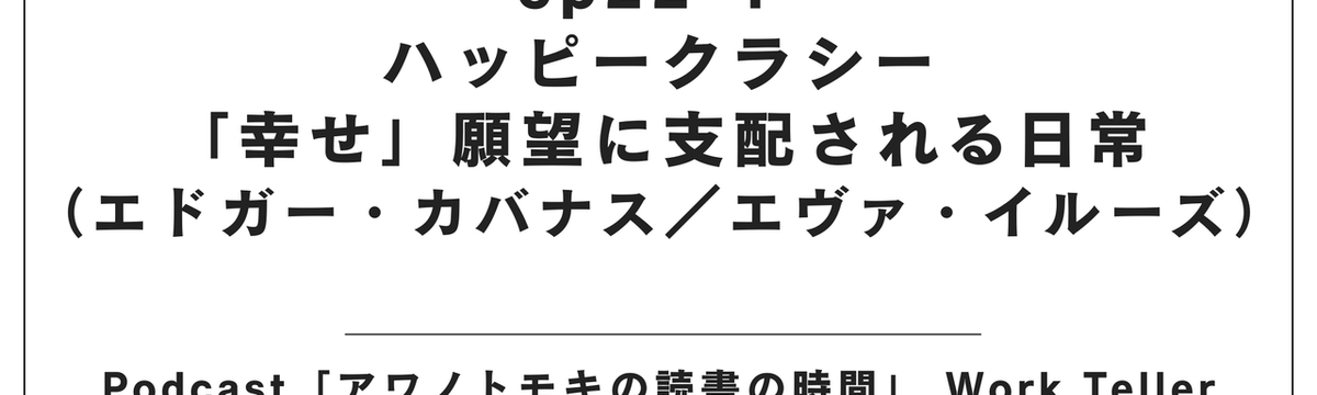 Tomoki Awano about 1 month ago Follow Podcast「アワノトモキの読書の時間」 Work Tellerep22-1「ハッピークラシー 『幸せ』願望に支... Podcast「アワノトモキの読書の時間」 Work Tellerep22-1「ハッピークラシー 『幸せ』願望に支配される日常」(エドガー・カバナス/エヴァ・イルーズ)「幸せ」を求めることが当然... Read more