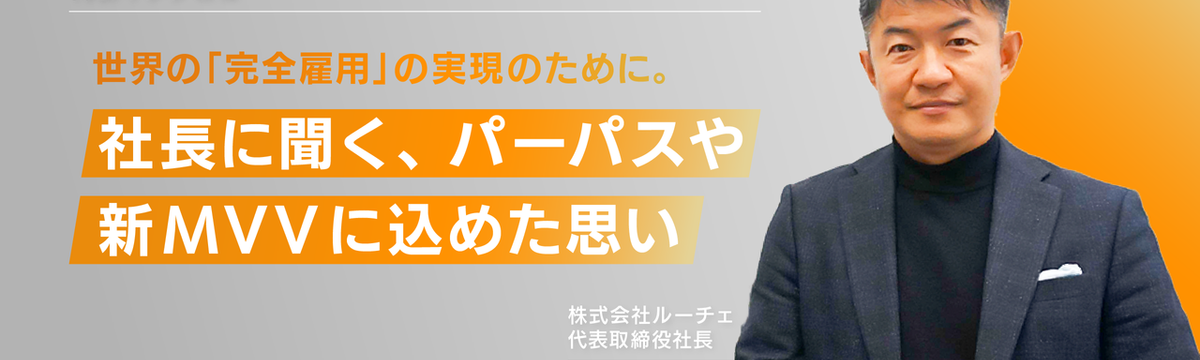 理念/目的 over 1 year ago Follow 遠藤 実花子 and 1 others 【代表インタビュー】世界の「完全雇用」の実現のために。社長に聞く、パーパスや新MVVに込めた思い 私たち株式会社ルーチェは「クライアントの未来をトモニ描き、トモニ創る」をサービスビジョンに掲げ、リクルートメントサクセスパートナー事業を通して企業様の経営革新に貢献することを目指しています。今回... Read more