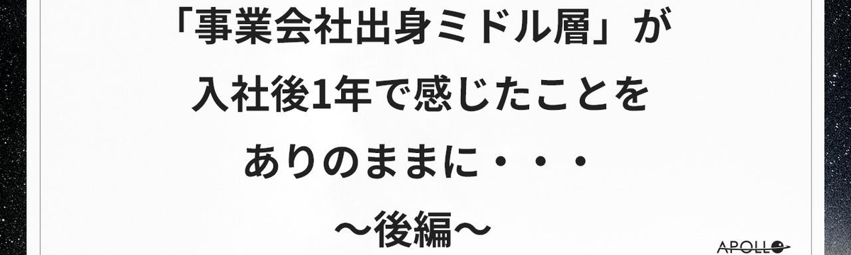 APOLLO Consultant Blog over 2 years ago Follow 林 正浩 「事業会社出身ミドル層」が入社後1年で感じたことをありのままに・・~後編~ 前編では、事業会社しか経験したことない私が、入社して感じたことや仕事のやりがいについてお話しさせていただきました。後編では、引き続き入社して感じたこと、働き方についてお話ししています。最後までお... Read more