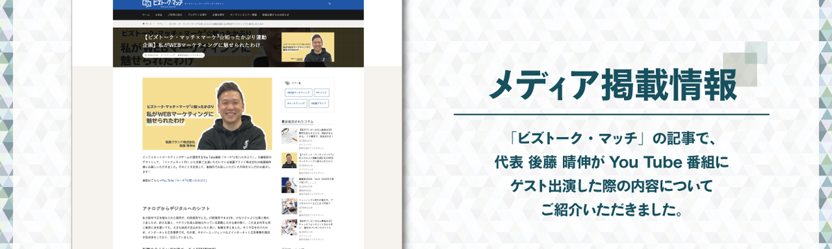 後藤ブランド株式会社 almost 5 years ago Follow Mai Suda 「ビズトーク・マッチ」にてコラム記事が掲載されました! オンラインミーティングマッチングサイト「ビズトーク・マッチ」のコラム記事にて、【ビズトーク・マッチ×マーケ3☆知ったかぶり連動企画】「私がWEBマーケティングに魅せられたわけ」が掲載されました!... Read more