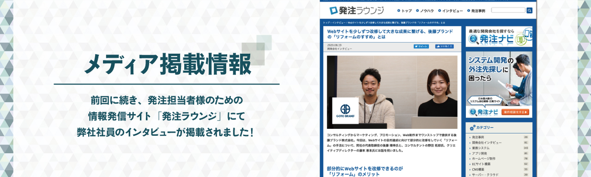 後藤ブランド株式会社 about 5 years ago Follow Mai Suda メディア掲載のお知らせ ついに第3回目、発注担当者様のための情報発信サイト「発注ラウンジ」に弊社のインタビュー記事が掲載されました!今回は、弊社で推奨しているWebサイトの「リフォーム」についてです!集客や問い合わせの... Read more