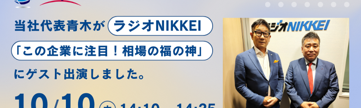 株式会社Ubicomホールディングス about 1 year ago Follow 白井 智美 当社代表青木がラジオNIKKEI「この企業に注目!相場の福の神」にゲスト出演しました! この度、当社代表取締役社⾧青木正之が、10月10日(木)にラジオNIKKEI「この企業に注目!相場の福の神」にゲスト出演しました!当社のビジネスモデルや今後のビジョンについて、財産ネットの藤本誠... Read more
