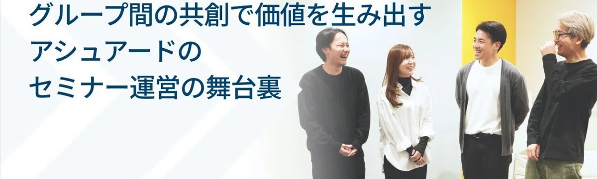 株式会社アシュアード 10 months ago Follow 福井 拓矢 and 1 others グループ間の共創で価値を生み出すアシュアードのセミナー運営の舞台裏 最初にこんにちは。Assured事業部 Market growthグループの福井です。ProjectReportでは、アシュアードメンバーひとりひとりのリアルな業務内容に焦点を当て、どんなことを... Read more