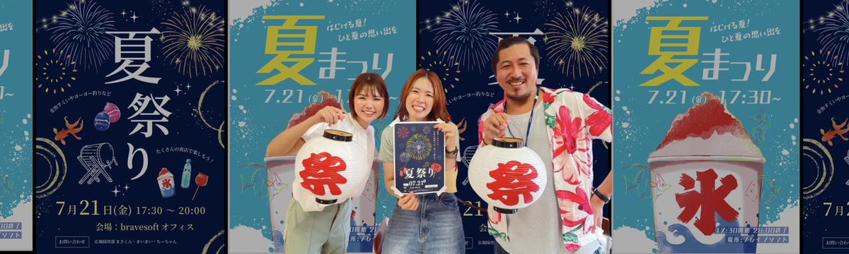 Culture & Events about 2 years ago Follow Masaomi Takase 【社内イベント】本日bravesoftは「夏祭り」開催! 本日7月21日、bravesoft社では5年ぶりの夏祭りが開催されます!過去、2017年と2018年に開催したんですが、ここ数年はコロナで実施できず・・・気づけば5年ぶりの開催となりました。もう... Read more