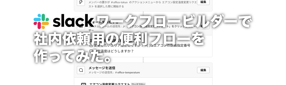 株式会社サーバーワークス's Blog about 6 years ago Follow Kousuke Matsumoto Slackワークフローで社内依頼用の便利フローを作ってみた!【エアコン編】 #slack_workflow活用 Slackが先日公開した新機能「ワークフロー」はもうみなさん触っていますか?Slackをお使いのみなさんによって活用記事やTweetがどんどん公開されてます。使い方などはたくさん公開されています... Read more