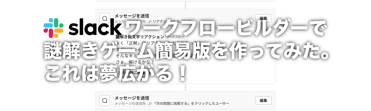 株式会社サーバーワークス's Blog about 6 years ago Follow Kousuke Matsumoto Slackワークフローで謎解きゲーム簡易版を作ってみた。夢広がる!【娯楽編】 #slack_workflow活用 前回Slackワークフロービルダーで社内便利フローを作ってみた話をしました。そして、いろいろワークフロービルダーを触ってみて私は数奇な運命を感じてしまったのです。Slackワークフローで謎解きゲ... Read more