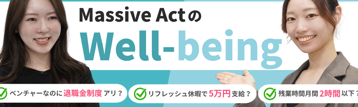 株式会社Massive Act 15 days ago Follow Reina Hamazawa ベンチャーなのに大手企業レベルの福利厚生?Massive ActのWell-being事情をご紹介します! こんにちは!PR/広報の濱澤です!当社は小規模組織で、ベンチャー企業であるわけですが「ベンチャーって裁量権はあるけれど激務で、制度もあまり整ってないイメージ...」そんな風に思っていませんか??... Read more