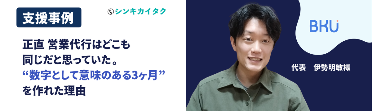 株式会社アスレバ 8 days ago Follow 新井 咲季 【支援クライアント事例インタビュー】株式会社BKU 伊勢明敏様 こんにちは!シニアコンサルタントの新井です。今回は、アスレバがご支援している企業様への事例インタビューをお届けします。営業代行というと「とにかく数を打つ」「結果だけが届く」イメージを持たれがちで... Read more