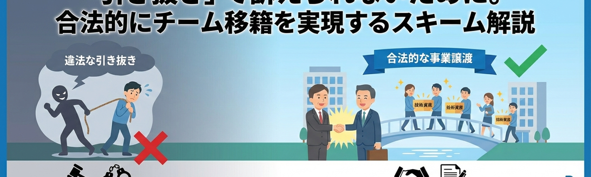 KAZUMA CHOFUKU 3 days ago Follow 「引き抜き」で訴えられないために。合法的にチーム移籍を実現するスキーム解説 「優秀なエンジニアチームを丸ごと迎え入れたい」「でも、強引に誘ったら前職の会社から訴えられるんじゃ……」「引き抜き行為がバレて、業界内で悪評が立つのが怖い」こんにちは。IT事業再生・M&A仲介『... Read more