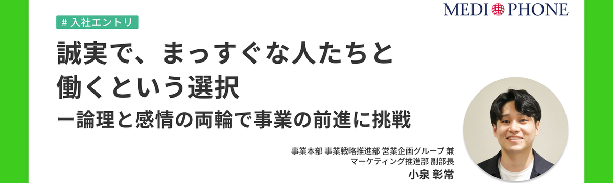 メディフォン株式会社 24 days ago Follow 大和 菜月 誠実で、まっすぐな人たちと働くという選択ー論理と感情の両輪で事業の前進に挑戦 ご挨拶と自己紹介はじめまして。2025年5月にメディフォンに入社した小泉と申します。現在は、事業戦略推進部・マーケティング推進部の一員として、営業企画、事業開発、マーケティングを担当しています。... Read more