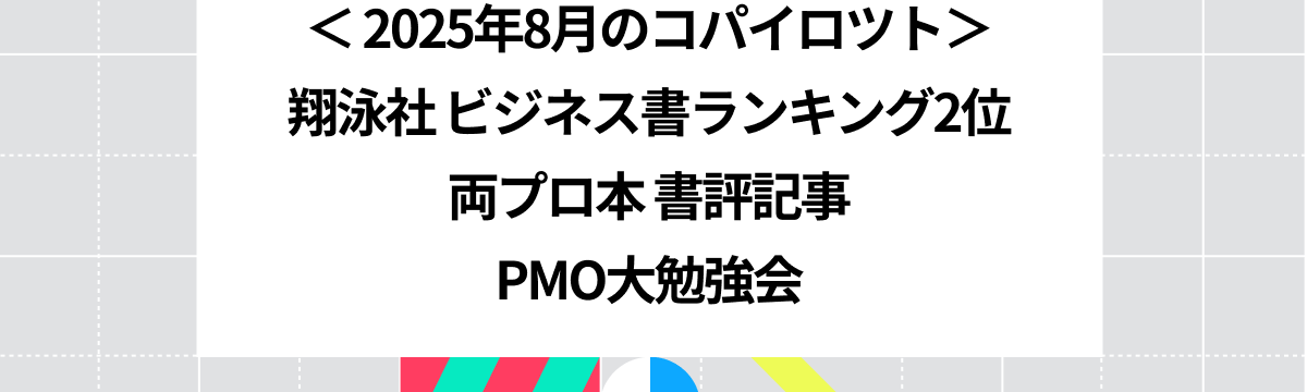 株式会社コパイロツト about 1 month ago Follow PR Team COPILOT 翔泳社ビジネス書ランキングで2位獲得...ほか、8月の活動まとめ こんにちは!コパイロツト情報発信です。9月の私たちの活動情報まとめをブログに公開しました!主なトピックは...翔泳社の2025年7月ビジネス書ランキングで、『両利きのプロジェクトマネジメント』が... Read more