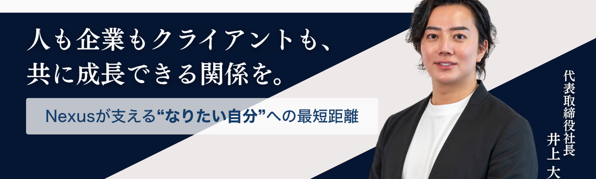 株式会社Nexus 13 days ago Follow 渡辺 翼 「人も企業もクライアントも、共に成長できる関係を。」──Nexusが支える“なりたい自分”への最短距離 こんにちは!株式会社Nexusの採用担当です。今回は弊社代表の井上にインタビューを行い、・なぜNexusを立ち上げたのか・どんな想いで事業を展開しているのか・Nexusの強みがどこにあるのか・今... Read more
