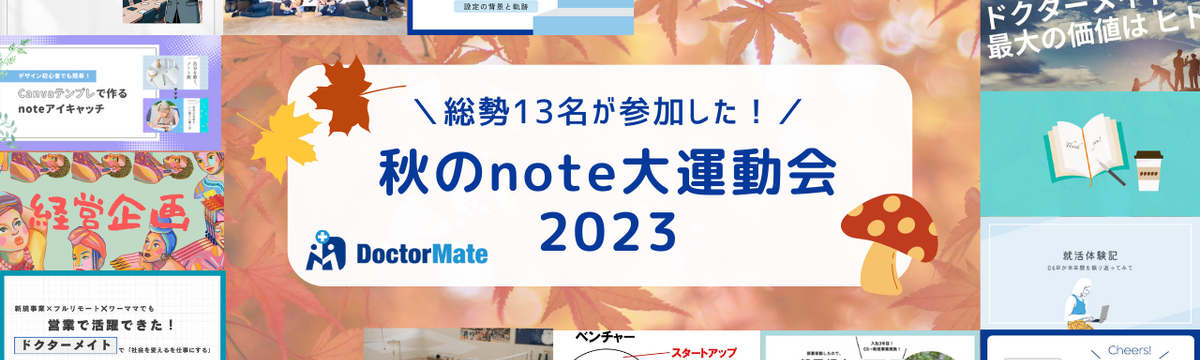 ドクターメイト株式会社 almost 2 years ago Follow 馬塲 純子 and 1 others 【あなたに届けたい!】思いのこもった『秋のnote大運動会2023』を紹介します! こんにちは、ドクターメイトのインターンチーム(佐野・馬塲)です!ドクターメイトは、いつでも介護関係者のそばに医療がある安心をお届けするため、日中医療相談、夜間のオンコール代行サービスのほか、介護... Read more