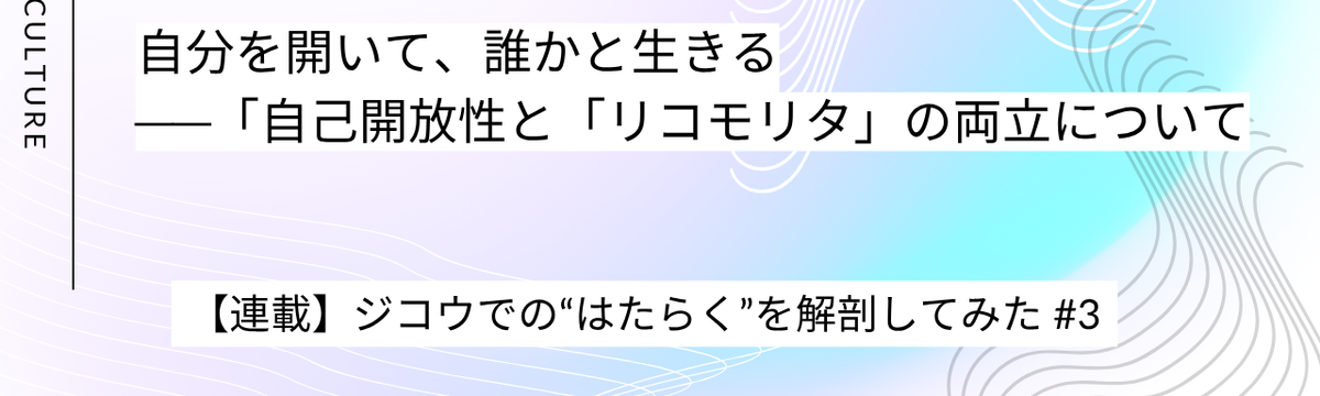 株式会社ジコウ 12 days ago Follow 株式会社 ジコウ 【カルチャー紹介】自分を開いて、誰かと生きる──「自己開放性」と「リコモリタ」の両立について こんにちは、ジコウです。この連載【ジコウでの“はたらく”を解剖してみた】では、私たちが日々の仕事を通じてどんな価値観を大切にしているのかを、言葉にしてお届けしています。前回の記事では、ジコウのカ... Read more