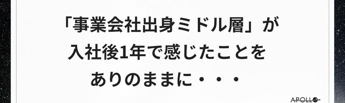 APOLLO Consultant Blog over 2 years ago Follow 林 正浩 「事業会社出身ミドル層」が入社後1年で感じたことをありのままに・・・~前編~ はじめにこんにちは。コンサルティングユニットの林と申します。アポロに入社してもうすぐ約1年が経過しようとしています。以前、「事業会社経験しかなく、コンサル未経験」でありながら「40代後半で初めて... Read more
