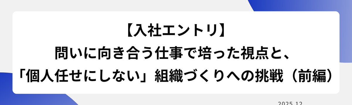 株式会社DotHire about 2 months ago Follow DotHire 採用担当 【入社エントリ】問いに向き合う仕事で培った視点と、「個人任せにしない」組織づくりへの挑戦 (前編) はじめに|自己紹介こんにちは、DotHireの採用代行事業(RPO)でシニアコンサルタントをしている塩田です。これまでブライダル業界でのウェディングプランナー・マネジメント経験を経て、人事、RP... Read more