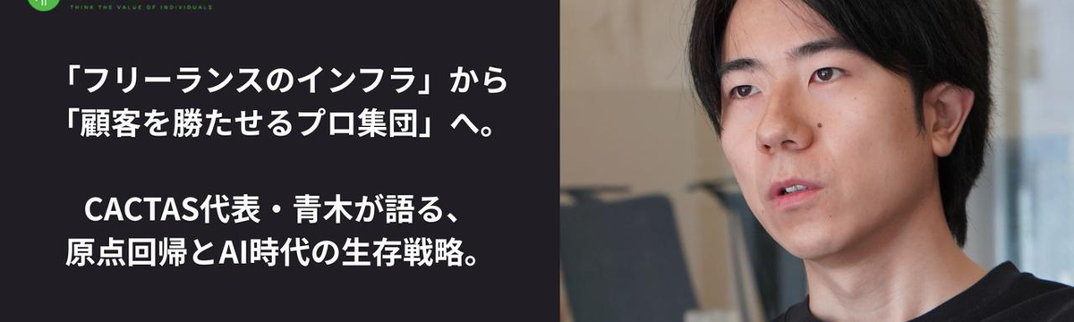 株式会社CACTAS 3 days ago Follow NAKAJIMA MIKIKO 「フリーランスのインフラ」から「顧客を勝たせるプロ集団」へ。CACTAS代表・青木が語る、原点回帰とAI時代の生存戦略。 動画制作・マーケティング支援で急成長を遂げる株式会社CACTAS(カクタス)。 これまでフリーランスのキャリアインフラを目指してきた同社が今、大規模なリブランディングを敢行します。そんな原点を持... Read more