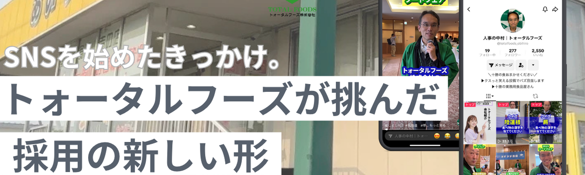 トォータルフーズ株式会社 14 days ago Follow Yuta Nakamura SNSを始めたきっかけ。トォータルフーズが挑んだ採用の新しい形 令和6年2月、私たち トォータルフーズ株式会社 はSNSの運用をスタートしました。SNS専門会社である 株式会社YOZORA (当時は代表の松浦氏が個人事業主として活動)を、銀行の紹介を通じて知... Read more