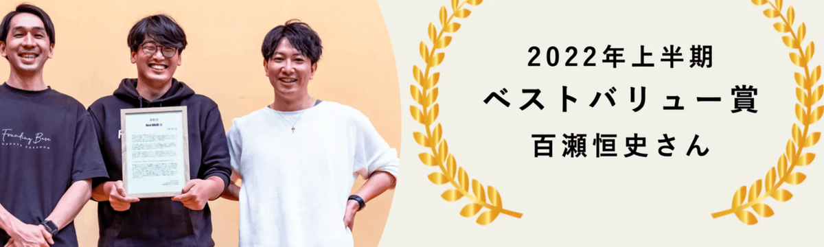 Corporate Blog almost 3 years ago Follow 塩見 舞子 and 2 others 2022年度上期『Best VALUE賞』 受賞インタビュー(百瀬恒史) FoundingBaseでは半期に一度全社で合宿を行っており、「高めあい、分かちあう場」として半期・通期の表彰式を行っております。本記事では、2022年度上半期Best VALUE賞を受賞した百... Read more