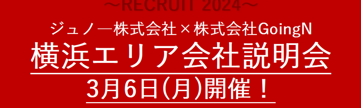 株式会社GoingN over 2 years ago Follow 採用担当 【3/6開催!24卒合同説明会】ジュノー株式会社 × 株式会社GoingN~横浜エリア~ 横浜エリア会社説明会~3月6日(月)開催~この度、2022年に業務提携を開始したジュノー株式会社との合同説明会を開催いたします。実際どんな会社なんだろう?どんな人が働いているんだろう?など様々な... Read more