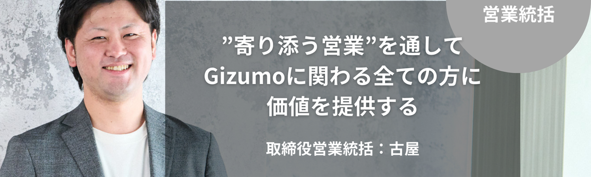 インタビュー over 2 years ago Follow 小松 奏恵 and 1 others [取締役 営業統括]”寄り添う営業”を通して、Gizumoに関わる全ての方に価値を提供する|古屋 淳史 Gizumoの小松です!みなさまにGizumoのことをさらに知っていただきたいと思い、メンバーのインタビューを行っています。今回は、取締役 営業統括の『古屋』にお話をお聞きしました!古屋さんはG... Read more