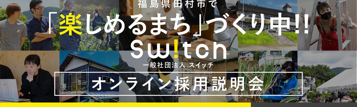 一般社団法人Switch about 4 years ago Follow 佐久間貴代 and 4 others 【オンライン採用説明会】福島県の田舎で「地域づくりメンバー」と「デザイナー」を大募集! 福島県田村市で「楽しめる場所を、ここにつくる。」をビジョンに、持続・自走するまちづくりを目指している一般社団法人Switchは、私たちと一緒に挑戦してくれる仲間を募集するために、オンライン採用説... Read more