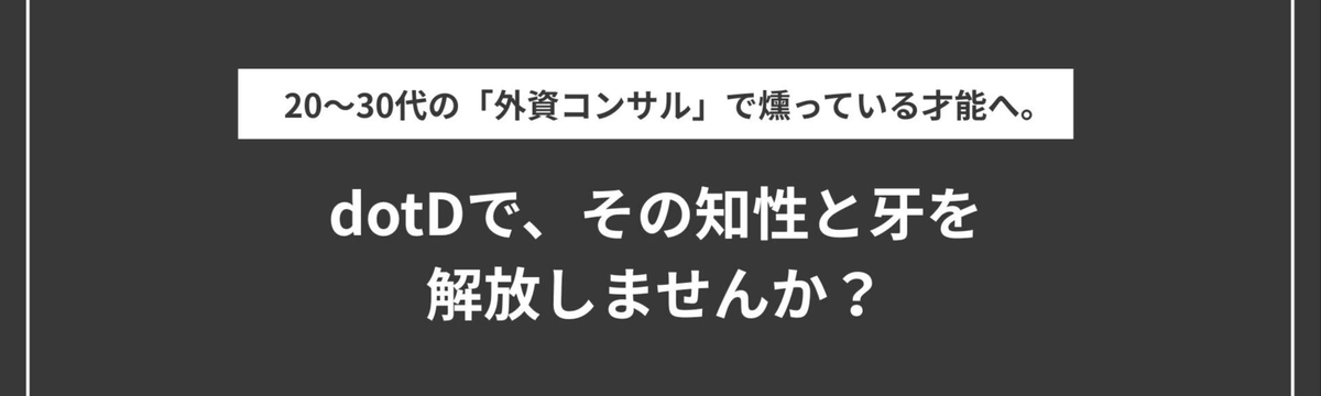 株式会社dotD about 1 month ago Follow kirita kana 20〜30代の「外資コンサル」で燻っている才能へ。dotDで、その知性と牙を解放しませんか? 2026年1月20日にdotD noteに投稿された記事です。目次外資コンサルの「賢さ」と、スタートアップの「自由度」を融合させるIdeationからPMFまで、ワンチームで事業創りに挑む「ブラ... Read more