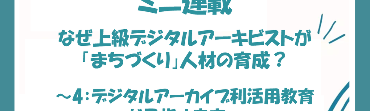Masahiro Houtoku about 2 years ago Follow なぜ上級デジタルアーキビストが「まちづくり」人材の育成? 〜第4回:デジタルアーカイブ利活用教育が目指す未来〜 こんにちは。上級デジタルアーキビストの寳德真大(ほうとく まさひろ)です。ここまで私の拙いミニ連載にお付き合いいただいた方、感謝申し上げます。今回は、なぜ、まちづくり人材の育成に取り組むのか、そ... Read more