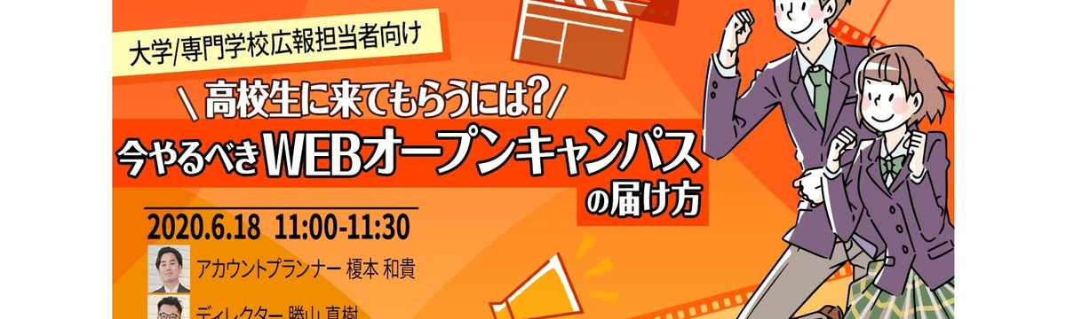 株式会社IMAGICA IRIS over 5 years ago Follow Sasaki and 2 others 【WEBセミナーを開催いたしました】"高校生に来てもらうには?動画広告会社が伝える「今」やるべきWEBオープンキャ... 大学/専門学校の関係者様を対象に、"高校生に来てもらうには︖動画広告会社が伝える「今」やるべきWEBオープンキャンパスの届け方"と題しまして、WEBセミナーを開催いたしました。新型コロナウイルス... Read more