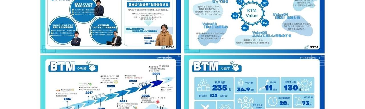 応募を検討中の方へ 19 days ago Follow 日髙 紗璃 4シートで分かるBTM💡これを読めばあなたもBTMマスター!? こんにちは!人財推進本部の日髙です。「BTMってどんな会社?」「最近よく聞くけど、どんな事業をしているの?」そんな疑問をたったの4シートで一気に解消しちゃいます✨この記事を読めば、あなたもBTM... Read more