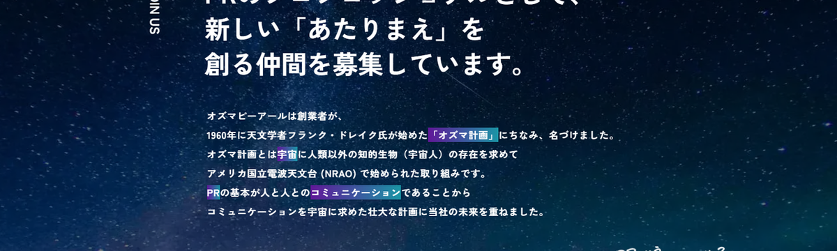株式会社オズマピーアール over 1 year ago Follow Riae Jeon 〈NEW〉採用ページが新しくなりました✨ 皆さんは当社の社名の由来をご存じでしょうか?オズマピーアールは創業者が、1960年に天文学者フランク・ドレイク氏が始めた「オズマ計画」にちなみ、名づけられました。「オズマ計画」とは、宇宙に人類以... Read more