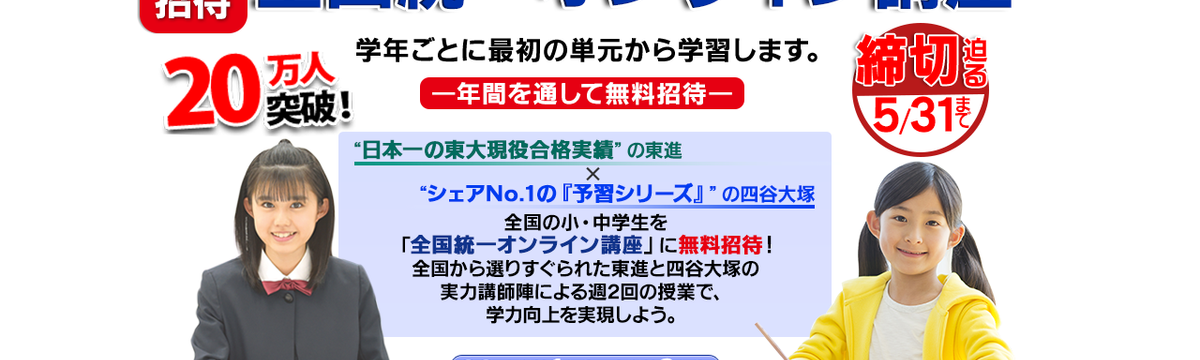 教育の技術革新への挑戦 over 5 years ago Follow 山本 葵 全国の小・中学生を「全国統一オンライン講座」に無料招待! 東進・四谷大塚からの特大プレゼント-東進と四谷大塚がタッグを組み、全国の小・中学生を「全国統一オンライン講座」に無料招待!-緊急事態宣言による全国の小中学校休校により、「勉強したくても学校に行け... Read more