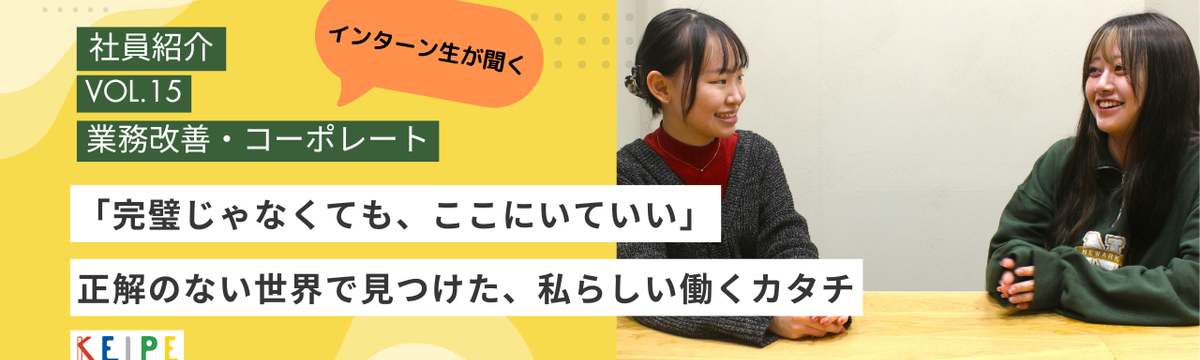 KEIPE株式会社 22 days ago Follow 田澤 ゆか 「完璧じゃなくても、ここにいていい」――正解のない世界で見つけた、私らしい働くカタチ 今年から本格的に開始したKEIPEの長期インターンプロジェクト。KEIPEでは、インターンを“労働力”や“人手”としてではなく、「共に歩み、共に成長していく仲間」として受け入れています。「広報」... Read more