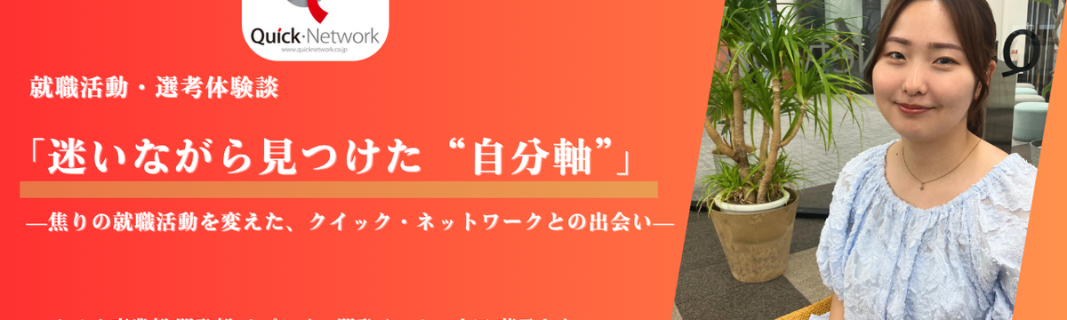 クイック・ネットワーク株式会社 24 days ago Follow 片山 咲良 【就職活動・選考体験談】迷いながら見つけた“自分軸”—焦りの就職活動を変えた、クイック・ネットワークとの出会い— 2025年に名古屋大学を卒業し、新卒でクイック・ネットワーク株式会社に入社した山田莉子さん。 30社以上の企業を見てきた就職活動は、業界や職種が定まらず苦悩・苦戦の日々でした。そんな彼女がクイッ... Read more