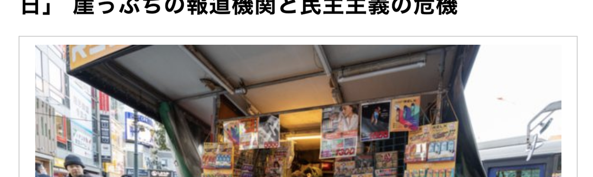 Matz about 1 month ago Follow 米国のニュース砂漠がジリジリ迫る日本でも「新聞が消える日」 崖っぷちの報道機関と民主主義の危機 米国ではローカル紙の消滅が著しく「ニュース砂漠」が広がっています。しかし日本の全国紙でも部数激減は著しく「新聞が消える日」は刻一刻と迫っているのではないでしょうか。ドラスティックな解決策が必要と... Read more