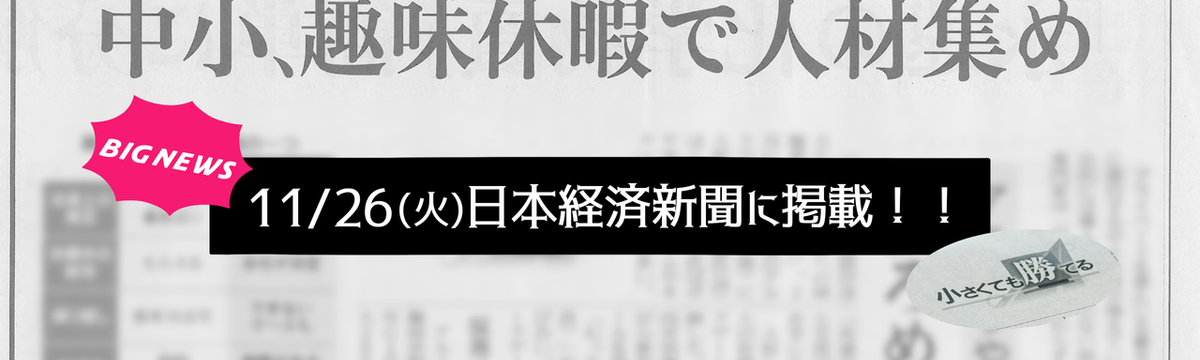 株式会社アルトワイズ about 1 year ago Follow 田中 杏実 11/26(火)日本経済新聞に掲載!!小さくても勝てる!今注目の趣味休暇が記事化 みなさん、こんにちは!広報部の田中です。突然ですが、ビックニュースです!!!なんと、アルトワイズに関する記事が本日、11月26日(火)の日本経済新聞 朝刊のビジネス2面に掲載されました!!!🎉✨... Read more