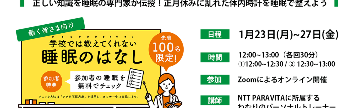 NTT PARAVITA株式会社 almost 3 years ago Follow Shizuka Harada 【参加無料】睡眠の専門家が伝授!「学校では教えてくれない睡眠の話」を1月23日(月)~27日(金)に開催決定 こんにちは!NTT PARAVITA株式会社広報担当の原田です。当社では、1月23日(月)~27日(金)までの1週間、働く全ての皆さまにご参加いただけるオンライン睡眠セミナー「学校では教えてくれ... Read more