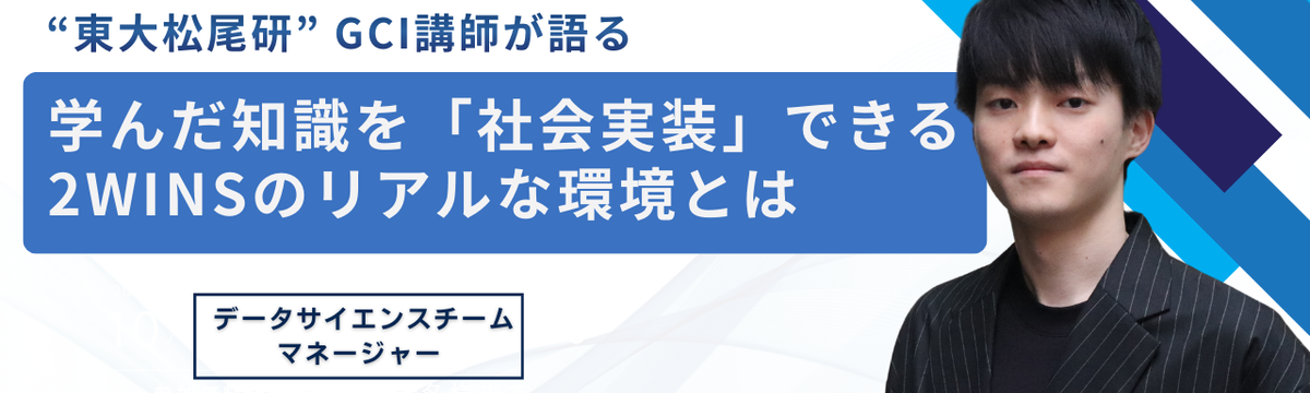 株式会社2WINS 21 days ago Follow 入田 浬玖 【GCI修了生必見】“東大松尾研” GCI講師が語る、学んだ知識を「社会実装」できる2WINSのリアルな環境とは こんにちは!株式会社2WINSの採用広報担当です 。2WINSは東京大学のある本郷を源流とし、東京大学大学院やインド工科大学出身者など世界トップクラスの技術者集団です。第2回目は、2WINSのデ... Read more