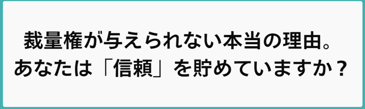株式会社ハーツネクスト 7 days ago Follow 畑 昌志 裁量権が与えられない本当の理由。あなたは「信頼」を貯めていますか? こんにちは、ハーツネクストの畑です。普段、面接をしていると「もっと裁量権が欲しい」「自分のやり方で自由に進めたい」という熱量の高い言葉を耳にします。自分の頭で考え、自分の意思をもって、自律自走し... Read more