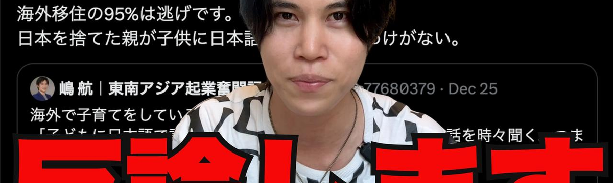 Yuji Mizutani 3 months ago Follow 【聞き飽きた議論】「海外移住の95%は逃げです」に対する感想 今回は「海外移住は逃げ」について話しました。X上では、主に生活難易度という観点で日本と海外のどちらが簡単であるかということに終始していたけど、この発言の根底には、「日本を見捨てる日本人への嫌悪感... Read more