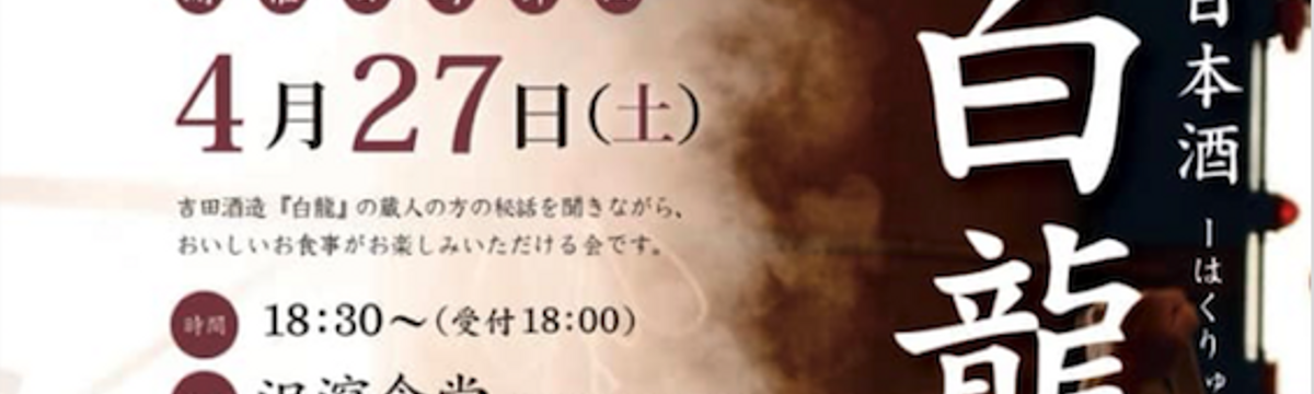 株式会社 ファスタ over 6 years ago Follow Michiko Takano 【イベント】日本酒 白龍−はくりゅう−を楽しむ会 沢瀉食堂にて、イベント開催!!吉田酒造「白龍」の蔵人の方の秘話を聞きながら、おいしいお食事がお楽しみいただける会です。イベント詳細日付:2019.4.27(土)時刻:18:30〜(受付は18:0... Read more