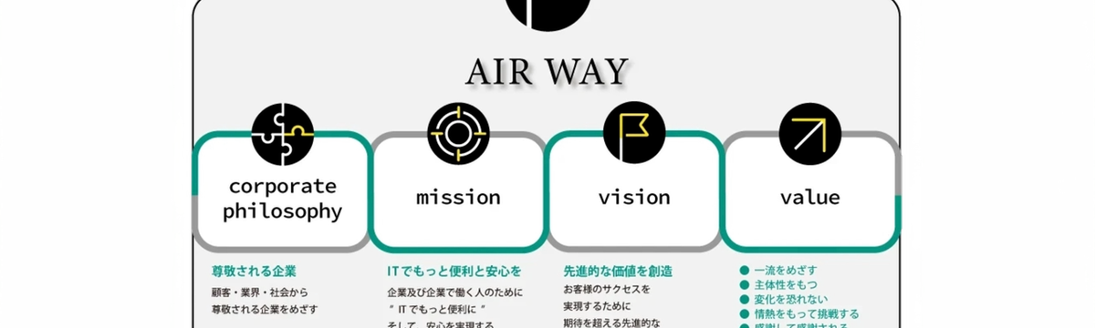 社長の一言/CEO about 1 year ago Follow 森 剛 「AIR WAY」私たちの理念・ミッション・ビジョン・バリュー 迷ったとき、立ち止まったとき、社員が立ち返る“羅針盤”。企業理念・ミッション・ビジョン・バリューをまとめた AIR WAY をつくりました。このAIR WAYは、トップダウンではなく、社員全員で... Read more