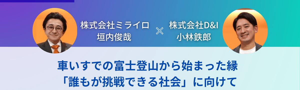 株式会社D&I 1 day ago Follow D&I 採用担当 車いすでの富士登山から始まった縁 「誰もが挑戦できる社会」に向けて【対談企画 株式会社ミライロ垣内俊哉 × 株式会... 障害のある当事者の視点から、インフラやソリューションを提供する株式会社ミライロ代表取締役社長の垣内俊哉さん。株式会社D&I代表取締役の小林鉄郎との対談企画が実現しました。前後編の2部でお送りしま... Read more