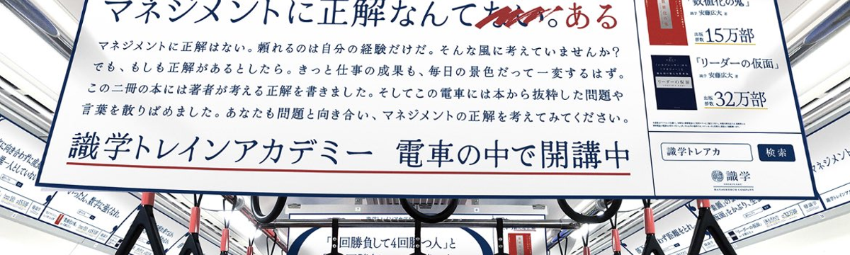 識学ブログ over 3 years ago Follow Munemitsu Kado 【告知】2022年6月16日~識学トレインアカデミー開講 丸ノ内線、銀座線を識学がトレインジャックします。 丸ノ内線、銀座線を識学がトレインジャックします!このようなPR企画を進めているのが弊社のマーケティング推進室です。識学を世の中に広める手段は無数にあります。その中の一つがトレインジャックなのです... Read more